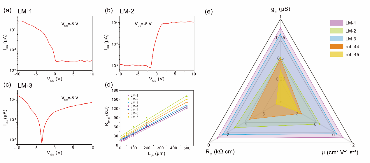 (a) ~(c) 液态金属LM-1,LM-2,LM-3晶体管的传输特性;