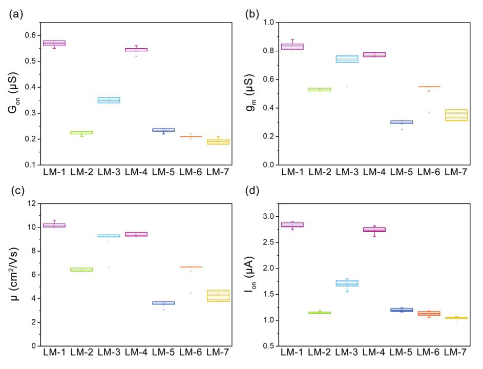 Figure 4. 基于七种液态金属的晶体管器件的输出特性。(LM-1~LM-7)