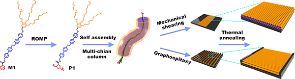 本文中,作者设计并合成了一种侧链液晶聚合物P1,它可以形成六方柱状相,其基本构筑基元是多链缠结的超分子柱,尺寸位于亚十纳米。研究发现,由于侧链的精确化学结构,超分子柱直径得以保持高度的均一性,且与聚合物分子量无关。通过简单的机械剪切可以在大面积范围内实现超分子柱的高度取向。此外,图案外延引导自组装的办法也能够使得P1的超分子柱自发垂直沟槽边缘取向。因此,利用侧链液晶聚合物可以构筑亚十纳米的高度有序结构,这种新的微纳结构构筑基元有望在纳米科学领域得到应用。