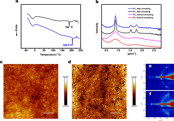 近日,北京大学陈尔强教授、杨爽副教授与麦克马斯特大学史安昌教授合作,设计了一种侧链液晶聚降冰片烯(P1),由于其长楔形的侧链以及主侧链之间的微相分离作用,该聚合物可以自组装形成长程有序的六方柱状相。研究表明,P1柱状相的基本构筑基元是多链超分子柱,每根柱截面内含约16根缠结的高分子链,柱子直径8.3 nm。由于侧链的精确结构,超分子柱直径保持很好的均一性。P1多链缠结的状态与神经纤维的柱状形式非常相似,原本长度有限的单个聚合物主链相互缠结连接,不断延长,使得柱子在柱轴方向不断生长,长度甚至超过1 μm。即使在低分子量情形下,P1同样可以形成长的柱子,并且缺陷较少。此外,P1的柱状结构可以利用简单的剪切进行大面积的取向,单一取向畴区的尺寸大于2.2*6.7 μm2。更有趣的是,利用图案外延法可以使P1的柱状结构自发地垂直硅片沟槽边缘排列。基于以上结果,研究者认为这种尺寸均一且很长的柱状结构可以作为一种新型的亚十纳米结构的构筑基元,相比于嵌段共聚物或液晶小分子等自组装基元,P1有微相分离结构均一、取向简单的独特优势,有望在纳米科学领域得到应用。该成果以题为” Highly Ordered Sub-10 nm Patterns Based on Multichain Columns of Side-Chain Liquid Crystalline Polymers“发表在国际著名期刊Macromolecules上。