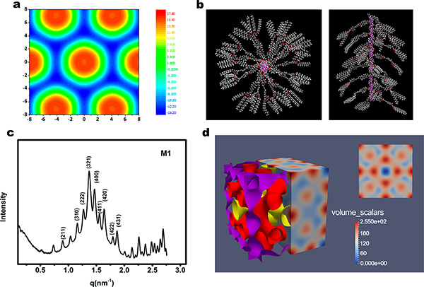(d) M1 Im3m立方相的3D电子密度重构图以及在(200)面处的2D截面。