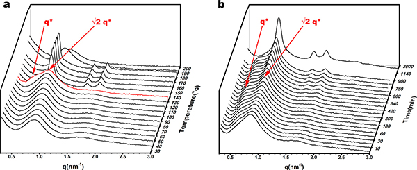 (b) P1L在110 ºC等温退火不同时间的1D XRD曲线。