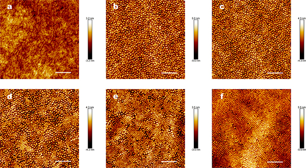 (f) 在135 ºC下退火36小时后,P1H在硅衬底上的AFM图像。