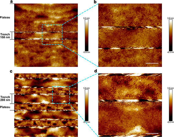 (a) P1H在150 nm宽度的图案外延沟槽中的AFM结果;