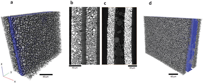 沿着XZ正交片(b),涂覆LiCoO2的新鲜态铝集流体(蓝色)的三维重建图(a)。(c,d)热失控后的铝集流体和LiCoO2残留物的XZ正交片和三维重建图。