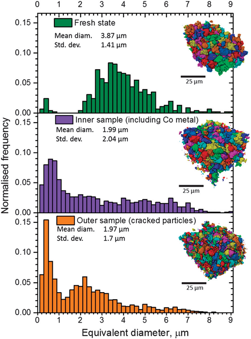 CT图像显示,刚开始是正极NMC颗粒具有接近圆形形貌,表面形貌相对均匀。老化后,颗粒出现裂纹,破碎成更小单元。
