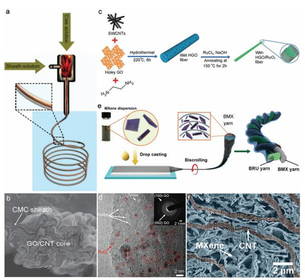 (a,b)同轴纺丝法制备被羧甲基纤维素(CMC)包裹的GO/CNT复合纤维,及其横截面的SEM图像;