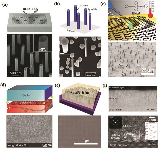 图2、在石墨烯层上直接生长1D纳米结构和3D薄膜以形成GR-1D和GR-3D MDW异质结构。(a)在石墨烯层上制造的1D ZnO纳米管的示意图和SEM,显示出复杂的位置和形态控制。(b)垂直排列的1D GaAs纳米线在石墨上的外延生长。(c)在石墨烯上的垂直单晶有机9,10-双(苯基乙炔基)蒽纳米线的溶液相外延生长。(d)石墨烯/硅衬底上的分子束外延生长的GaAs薄膜的示意图和SEM图像。(e)在ZnO涂覆的石墨烯上GaN层的外延生长。(f)SrTiO3/石墨烯/SrTiO3薄膜的横截面TEM,显示用脉冲激光沉积法在石墨烯上外延氧化物生长。