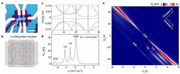 近期,美国劳伦斯-伯克利国家实验室的王枫、复旦大学的张远波以及斯坦福大学的D. Goldhaber-Gordon(共同通讯作者)等人发表文章报道了在ABC-三层石墨烯(TLG)以及六方氮化硼(hBN)摩尔超晶格中发现可调超导性特征。与“魔角”双层石墨烯(TBG)不同,理论计算显示,在垂直位移场下,ABC-TLG/hBN异质结构中能够产生三角超晶格,其具有与Hubbard模型关联的独立的微价带(valence miniband)。而这种微价带的带宽可以根据垂直位移场进行连续调控。因此你,研究人员通过施加垂直位移场,发现ABC-TLG/hBN超晶格在20开尔文的温度下表现出莫特绝缘态。进一步冷却操作发现,在1开尔文温度以下出现了超导性特征(“domes”)。通过进一步调控垂直位移场,研究人员还成功实现了超导体-莫特绝缘体-金属相的转变。这一成果表明,ABC-TLG/hBN作为一种模型系统,能够为深入探索三角Hubbard模型中出现的关联行为提供可能性。2019年07月17日,相关成果以题为“Signatures of tunable superconductivity in a trilayer graphene moiré superlattice”的文章在线发表在Nature上。