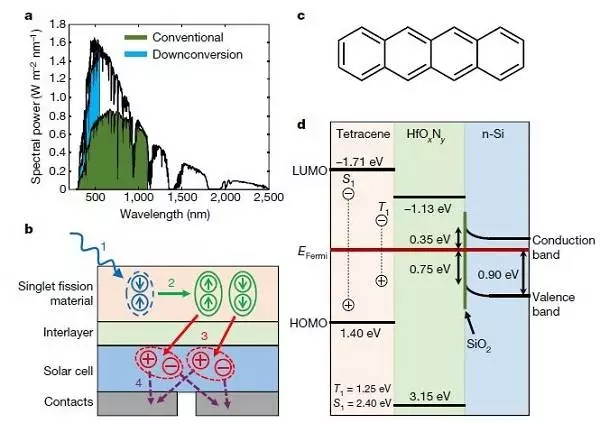 硅材料可以说在目前决定着太阳能电池技术的发展。然而,当吸收光子时,硅经常会产生大于其带隙的能量耗散。通过单重态激子裂变来敏化硅太阳能电池,从而可以减少热损失并提高电池的工作能力。在这个过程中,单重态激子中具有更高能量的光激发态能够裂变形成两个三重态激子激发态。在分子半导体并苯化合物中,单重态激子裂变产生的三重态激子被认为与硅带隙非常相符。当这些三重态激子转移到硅中时,能够产生额外的电子-空穴对,使得电池效率从29%提高到35%。然而,太阳能电池中的硅钝化层能够阻碍激子转移的发生,使得电池效率无法进一步提高。