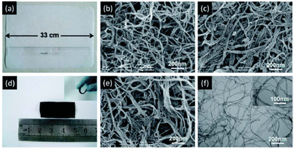 c) 一维结构高的纵横比可组装成为无粘结剂的且相互连接的网络膜或衬底用于柔性储能器件