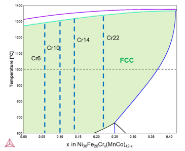 图一、 使用TCHEA3数据库在Thermo-Calc中计算的Mn:Co = 1:1的Ni38Fe20Crx(MnCo)42-x的准二元相图