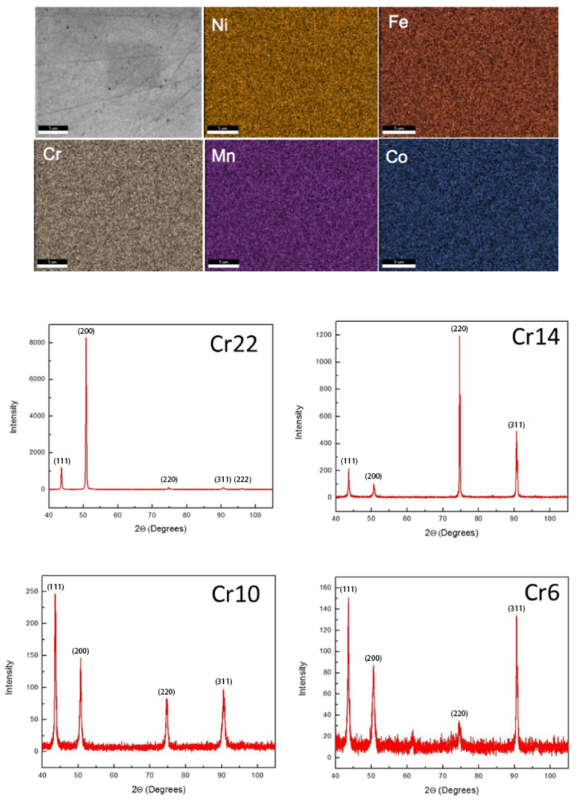 (a)在1100℃下均化96小时后Cr22的EDS映射,显示出元素的均匀分布。 (b)Cr22,Cr14,Cr10和Cr6的XRD图案,其峰值对应于FCC结构。