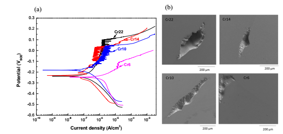(a)合金在暴露于空气的浸没池中在30℃下在0.6M NaCl中的动电位极化曲线; (b)在空气暴露的浸没池中在30℃下在0.6M NaCl中极化后发现的沿暴露区域边缘的缝隙腐蚀的SEM图像。