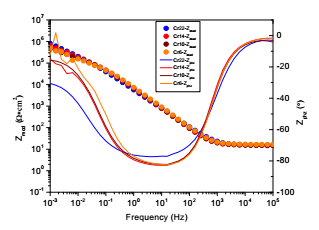 EIS结果显示在环境温度下在N2脱气的0.6 M NaCl溶液中保持10分钟OCP后,HEA Cr6,Cr10,Cr14和Cr22的阻抗模量,Zmod和相角Zphz。