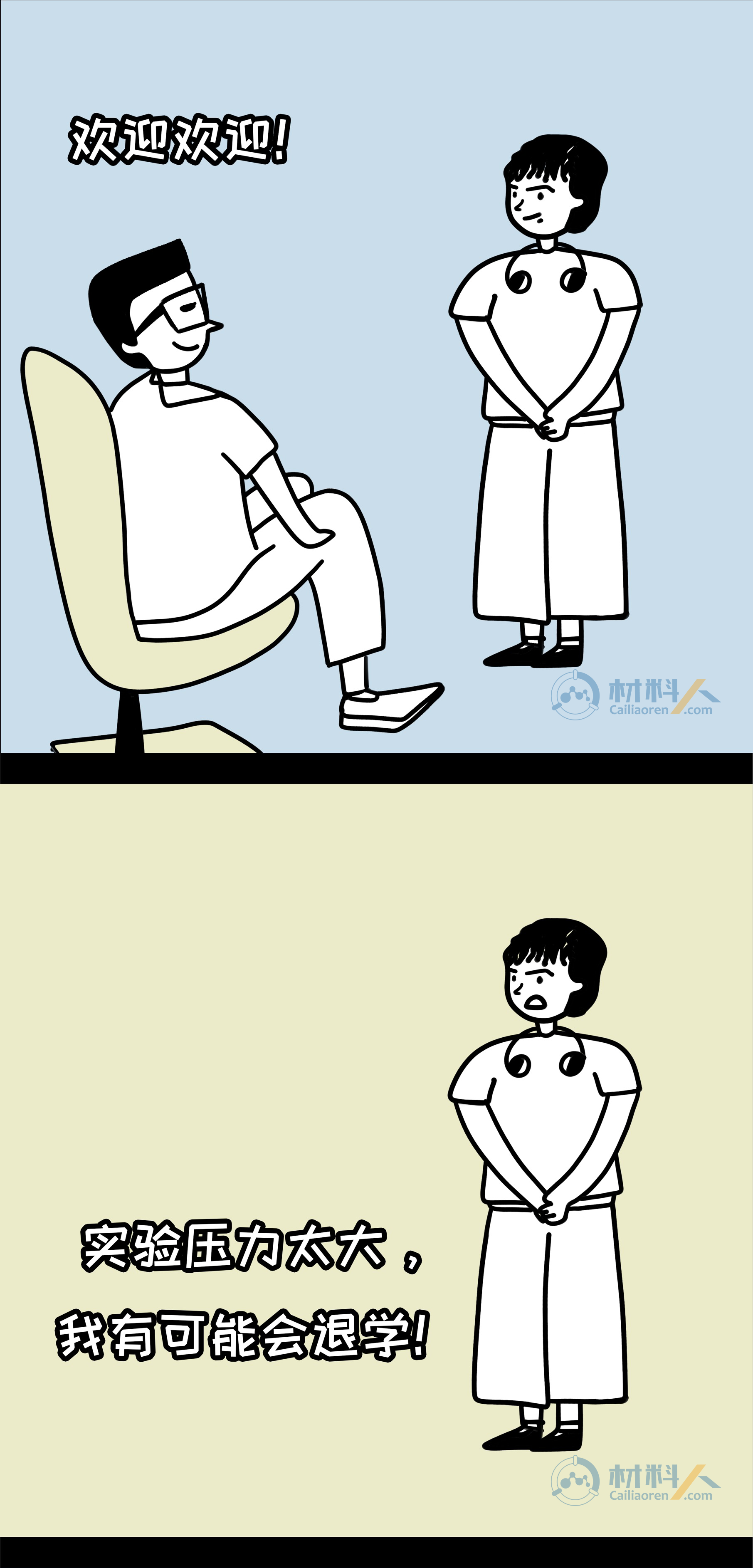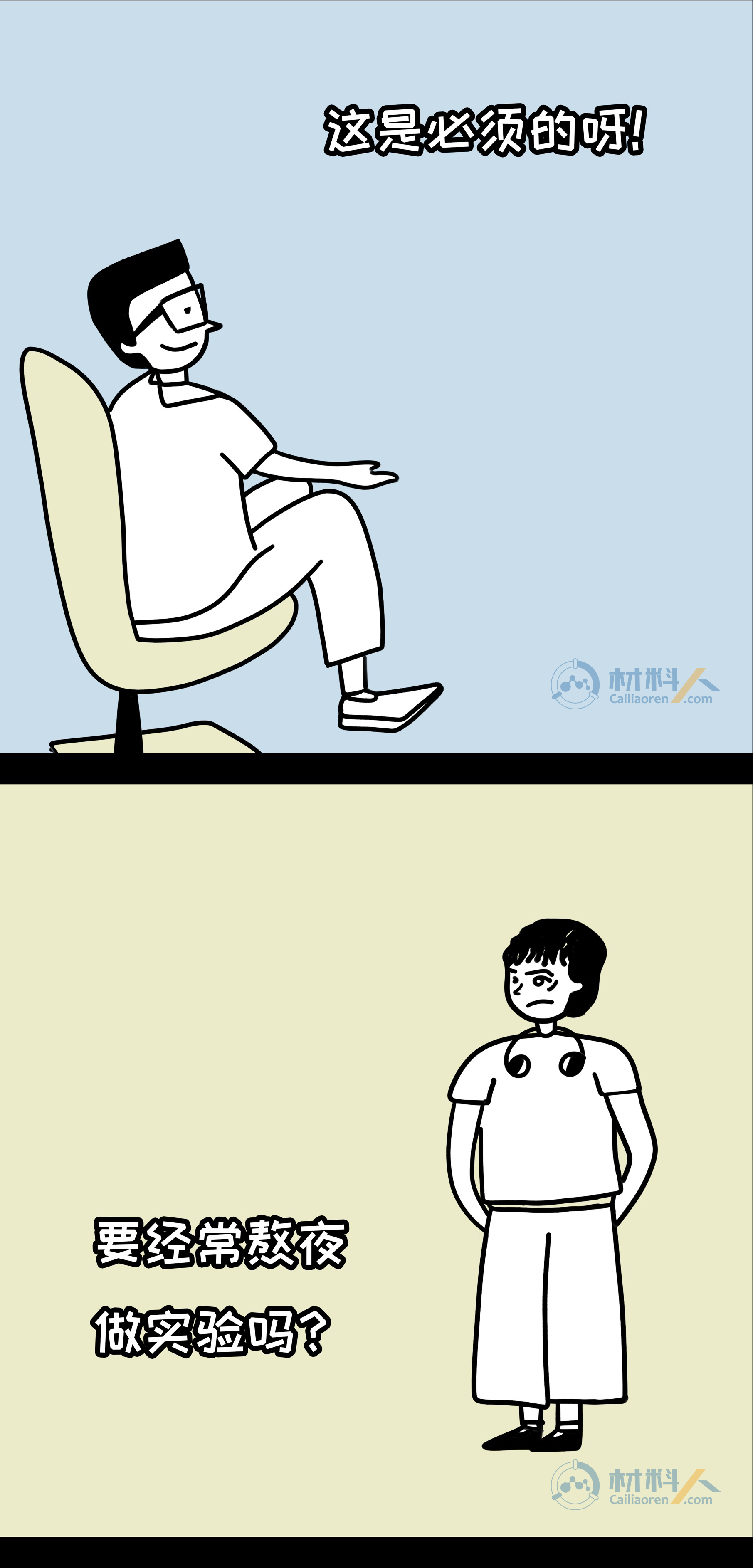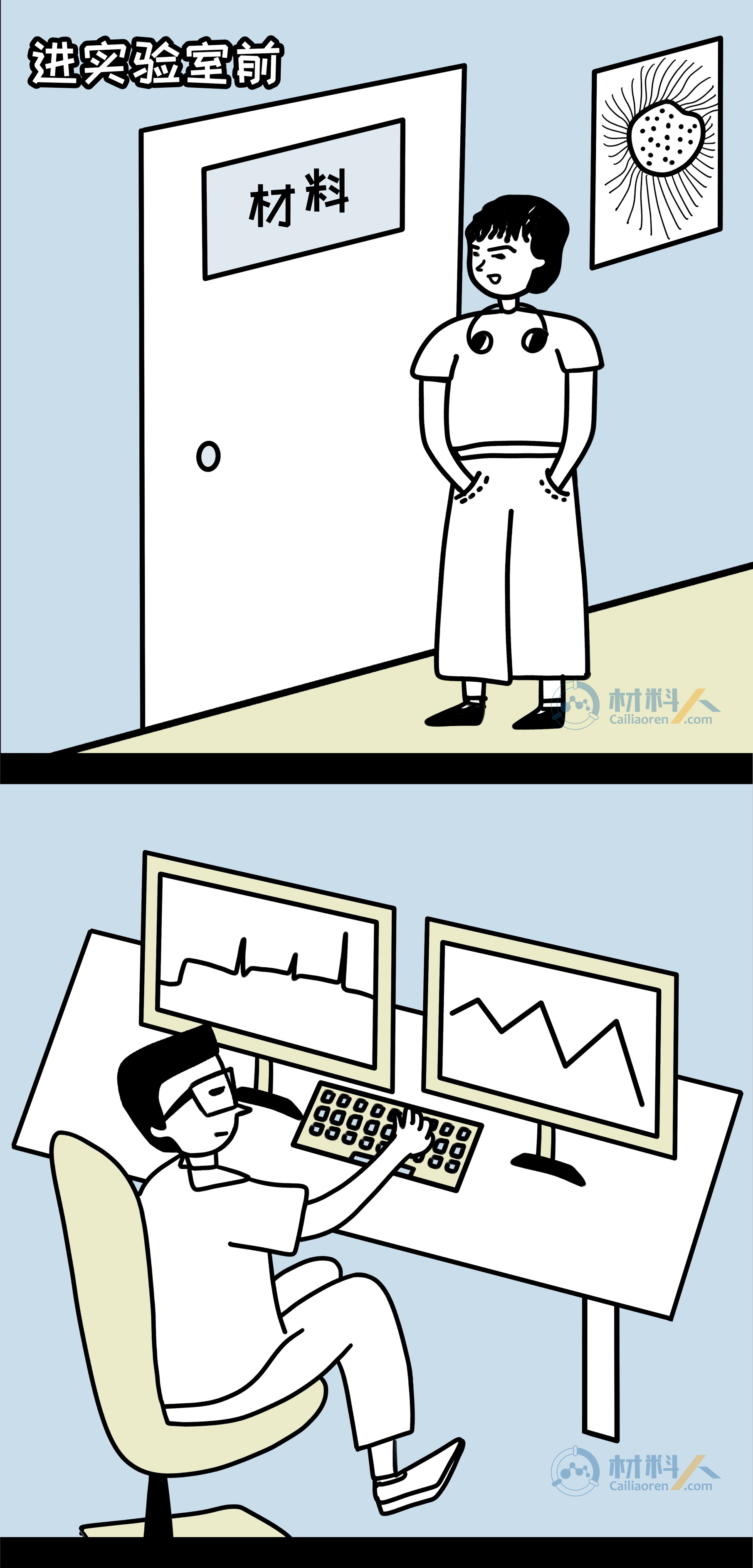 科研生活的理想与现实—读博前VS读博后youyoucao2019-07-27观点8.9K敢问哪位科研萌新在走进实验室前没有幻想过这样的生活:导师博学负责、同学团结友爱、实验一帆风顺,手握N篇SCI,毕业直接走上人生巅峰?敢问哪位导师没有向学生描绘过这样的前景:工作环境优越、实验设备高端、手握大把项目、优质论文批量产出? 然而现实…… 注:漫画内容纯属虚构,如有雷同,纯属巧合。 理想很丰满,现实却很骨感,但还是希望每个人都有一个精彩的科研生涯,一起加油吧! 本文漫画作者为藩鼠,由材料人编辑,文章灵感来源于网络。 未经允许不得转载:材料牛 » 科研生活的理想与现实—读博前VS读博后