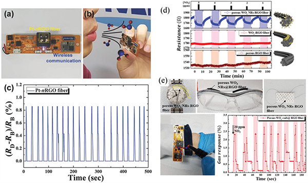 (e) 将GBF 化敏电阻器集成在手表、眼镜和Kimtech纸上以及用于实时NO2气体检测的信号传输模块的照片。