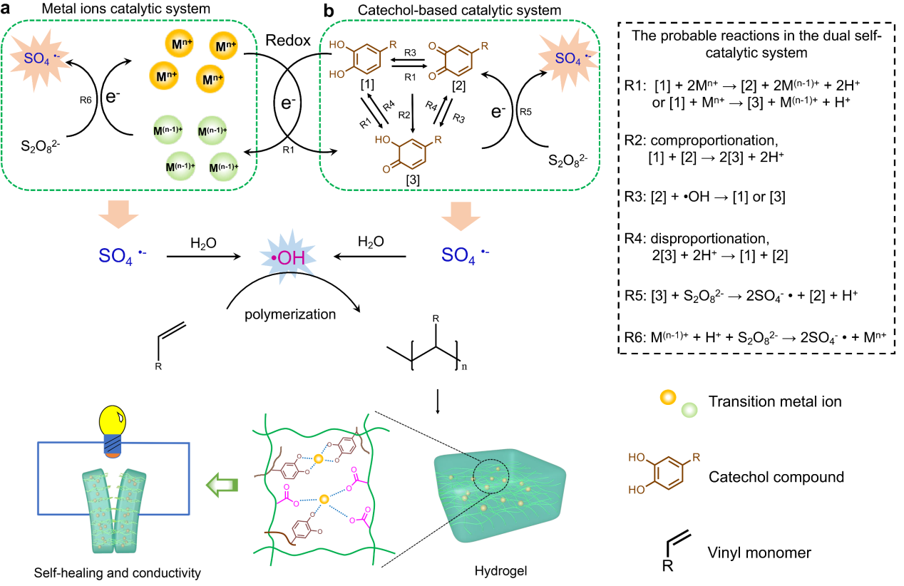 针对以上问题,西南交通大学鲁雄教授团队基于仿贻贝化学,提出了一种由过渡金属离子和儿茶酚基分子组成的新型双重自催化体系。该体系在没有任何外界刺激的情况下,能有效地引发自由基聚合,制备具有韧性、导电性、透明性和自愈性的水凝胶。