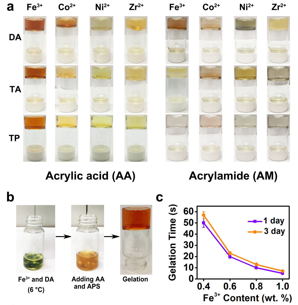 图2 基于多种金属离子和儿茶酚基分子的双重自催化体系的普适性。 (a) 过渡金属铁(Fe3+、Co2+、Ni3+、Zr3+)与含儿茶酚分子(多巴胺、单宁酸、茶多酚)在室温下聚合的AA、AM水凝胶的数码照片。(b) DA-Fe水凝胶的低温凝胶图。(c) 预聚溶液在室温下存放1天和3天后,水凝胶凝胶化时间随Fe3+浓度的变化。