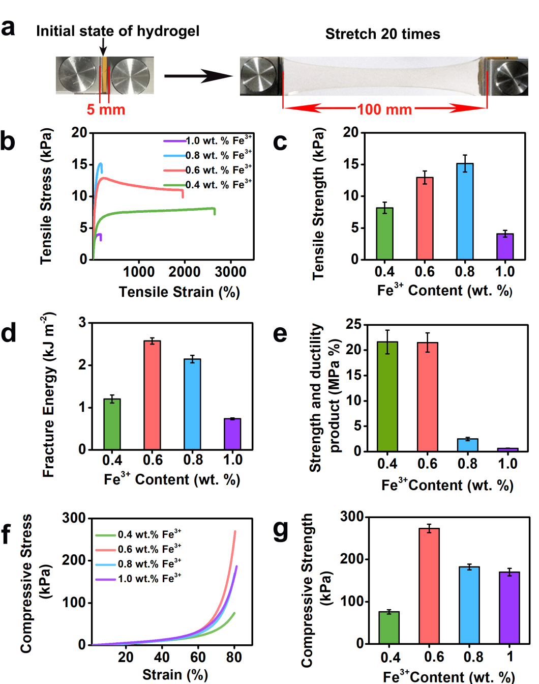 图3 DA-Fe-PAA水凝胶的力学性能。(a) 水凝胶拉伸试验的数字图像(0.6 wt % Fe3+)。(b) 典型拉伸应力应变曲线,水凝胶的最大拉伸倍数超过20倍。(c) 拉伸强度,最大拉伸强度超过15 kPa。(d) 断裂能,最大断裂能为2145 J m−2。(e) 强伸积,最大强伸积达到21 MPa %。(f) 典型压缩应力应变曲线,最大压缩强度达到280 kPa。(g) 水凝胶的抗压强度随Fe3+含量的变化。