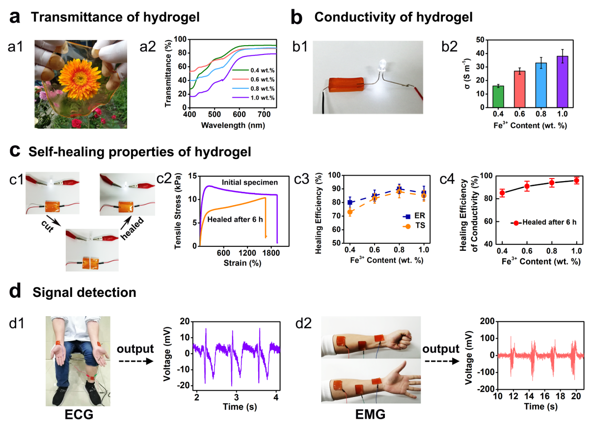 图4 DA-Fe-PAA水凝胶的导电、透明、自愈和生理信号检测特性展示。(a) 水凝胶透光率: (a1)透明水凝胶覆盖在花上的实物照片;(a2)水凝胶的紫外透光率随Fe3+含量的变化。(b) 水凝胶导电性: (b1)水凝胶导电性实物照片;(b2)水凝胶电导率随Fe3+含量的变化。(c) 水凝胶的自愈特性: (c1)自愈后水凝胶导电性实物照片; (c2)原始愈合水凝胶的典型拉伸应力应变曲线(0.6 wt % Fe3+); (c3)水凝胶自愈6 h后的机械自愈效率(TS和ER); (c4)愈合6 h后,水凝胶导电率随Fe3+含量的变化而变化。(d) 水凝胶作为电极检测(d1) ECG和(d2) EMG信号。