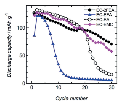 图十二、 LCO / Li纽扣电池的放电容量相对于258C的循环次数的变化。 电解质溶液:1m LiPF6溶液,在EC:EA,EC:2FEA,EC:EFA和EC:EMC的等摩尔混合物中。 将纽扣电池以恒定电流(1C)模式充电并进一步充电以保持恒定电压(4.2V)。 总充电时间设定为1小时。 然后将纽扣电池以恒定电流(1C)放电至3.0V