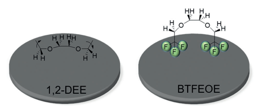 左:1,2-二乙氧基乙烷(1,2-DEE)的α-亚甲基(-O CH2-)靠近并平行于a-Si阳极表面,而其-CH3基团可自由旋转和弯曲。 右:双(2,2,2-三氟乙氧基)乙烷(BTFEOE),一种氟化醚,具有更直立的α-亚甲基(-O CH2-)和b-亚甲基(-OCH2CF3)基团 在a-Si阳极表面上具有更多的倾斜角度,因此观察到更有序的界面。