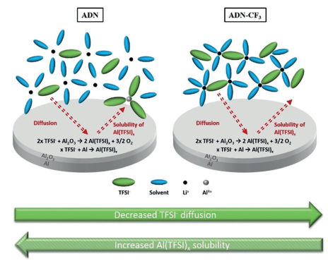 图十六、 ADN和ADN-CF3的示意图和氟化对铝溶解机理的影响