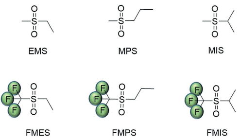 图十七、 所考虑的砜溶剂EMS,FMES,MPS,FMPS,MIS和FMIS的结构式。