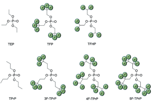 图二十、 所考虑的助溶剂TEP,TFP,TFHP,TPrP,3F-TPrP,4F-TPrP和5F-TPrP的结构式
