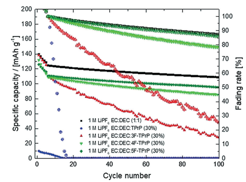 NMC /石墨细胞中30%磷酸盐混合物(三丙基磷酸酯(TPrP),三(3,3,3-三氟丙基)磷酸酯(3F-TPrP),三(2,2,3,3-四氟丙基)磷酸酯的循环行为 (4FTPrP)和三(2,2,3,3,3-五氟丙基)磷酸酯(5F-TPrP))与参比电解质在208℃下以Li作为RE进行比较。 在5个形成循环中,充电和放电过程的充电速率设定为0.1℃