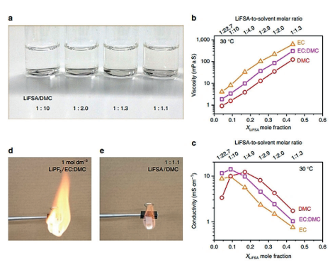 图四、取决于溶液浓度的物理化学性质 a)各种盐 – 溶剂摩尔比的LiFSI / DMC溶液的图像。 b)在30℃下,DMC,EC和EC中的LiFSI溶液的粘度和c)离子电导率:DMC(等摩尔)。 XLiFSI摩尔分数是LiFSI盐的摩尔量除以盐和溶剂的总摩尔量。 溶液的LiFSI与溶剂的摩尔比显示在上轴上。 d)在1.0mol dm-3 LiPF6 / EC:DMC(1:1v / v)的商业稀释电解质上的火焰试验和e)1:1.1LiFSI:DMC的自制超浓缩电解质。