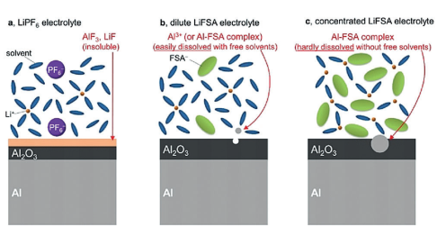 a)常规LiPF6基电解质中,b)具有大量游离溶剂分子的稀释LiFSI / AN电解质,和c)没有游离溶剂分子的高浓度LiFSI / AN电解质。