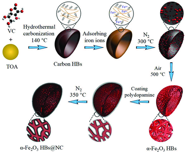 图二α-Fe2O3 HBs @ NC的软/硬模板法的示意图。