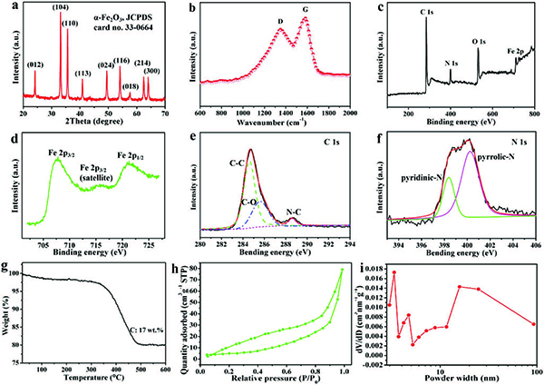 (h)N2吸附-解吸等温线以及α-Fe2O3 HBs @ NC的孔径大小分布。