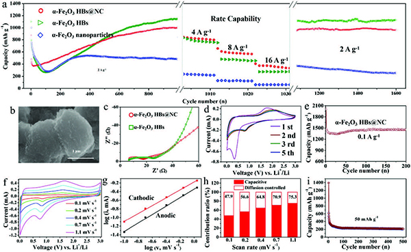 (a)α-Fe2O3 HBs @ NC,α-Fe2O3 HBs和α-Fe2O3纳米颗粒的循环性能和倍率性能。