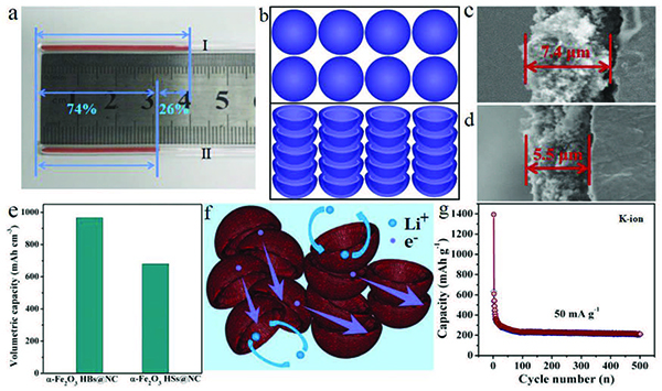 近年来,在过渡金属氧化物作为锂离子电池(LIBs)的新型高容量负极的应用方面取得了一些实质性进展。赤铁矿(α-Fe2O3)由于其理论比容量高(1006mAh g-1),环境友好,成本低而被广泛研究。然而,α-Fe2O3在锂化/脱锂过程中其电导率低和显着的体积膨胀(≈96%)导致长循环期间电极的粉化和电子电导的缺失。因此,基于α-Fe2O3电极的电池库仑效率低,容量快速衰减和倍率性能差。钾离子电池(KIB)最近已成为LIB的低成本选择,但在使用金属氧化物作为基于转化反应的钾离子负极材料时也面临同样的问题。为了克服这些缺点,一种有效的策略是制备具有中空结构的Fe2O3,例如气泡状的纳米棒,纳米管,微型盒和中空微球。这种结构可以缓解离子嵌入/脱出过程引起的体积膨胀效应,并改善电极和电解液之间的接触,从而改善其循环稳定性。然而,中空结构中过多的内部空间大大降低了颗粒的堆积密度,降低了电池的体积能量密度。此外,由于空隙空间,Fe2O3电极中固有的电导率低的问题可能变得更加恶化,导致其在大电流密度下性能恶化。