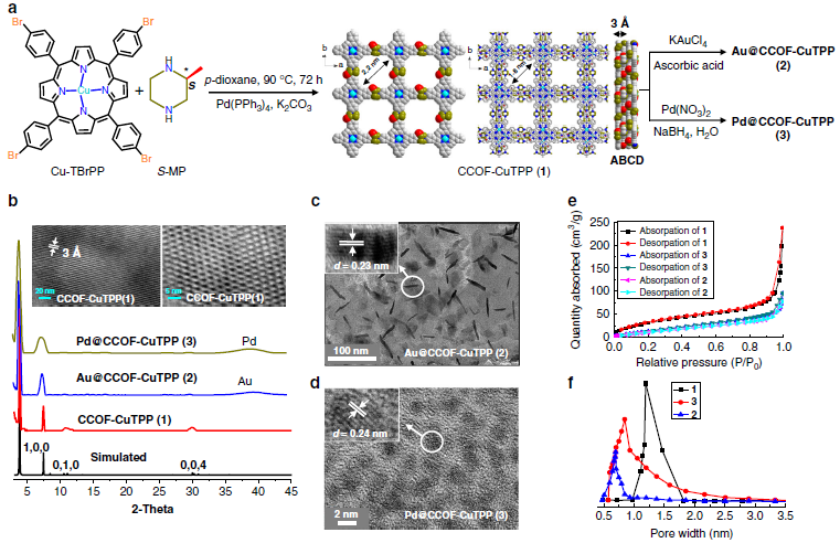 (a) CCOF-CuTPP、Au@CCOF-CuTPP和Pd@CCOF-CuTPP的合成过程及CCOF-CuTPP的空间填充模型