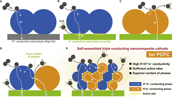 (B-E)基于质子导体电解质的PCFC和具备(B)氧离子-电子混合导电电极,(C)质子-电子混合导电电极,(D)传统氧离子-电子-质子三导电电极,和(E)自组装氧离子-电子-质子三导电纳米复合电极。