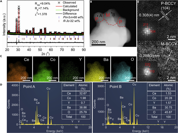 (B-E)BCCY复合颗粒的(B)STEM图像,(C)STEM-EDX结果,(D)A和B点EDX扫描结果,和(E)HR-TEM图像。