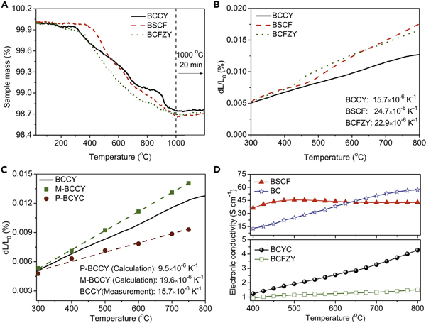 (D)采用4探针直流电导率技术测量的BCCY复合材料、BSCF、BCFZY和BC样品在400°C-800°C空气中的电子电导率。