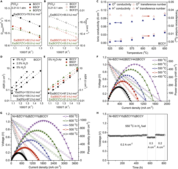 (D)基于BCCY复合电极和BZCYYb电解质的对称电池在不同H2O分压的空气中400°C-650°C的温度范围内的Arrhenius图。