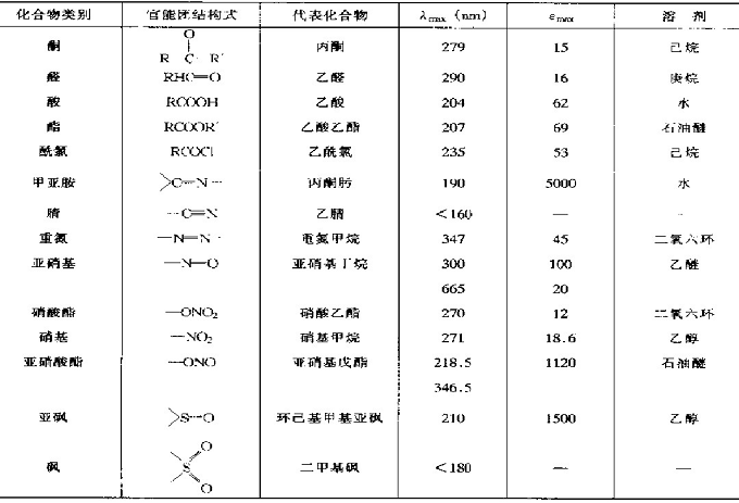 d. 含不饱和杂原子的化合物,由于存在n→π*跃迁,尽管吸收强度低,但是其吸收位置佳,易于检测,在紫外鉴定中有不可忽视的作用。