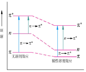 溶剂极性增大导致π→π*跃迁能量减少,吸收带红移;n→π*跃迁能量增大,吸收带蓝移。