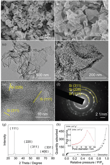 Tang[1]等以氧化石墨烯(GO)纳米片为模板,在其表面水解TEOS以生长SiO2层,得到GO/SiO2。将GO/SiO2于空气中一步煅烧,得到介孔SiO2(m-SiO2)。随后将m-SiO2粉末、NaCl和Mg粉混合均匀,在Ar中煅烧,冷却去除MgO和残留的SiO2,得到二维多孔Si纳米片,该纳米片由大小为~10nm的Si纳米晶团聚而成。该二维多孔Si纳米片可用作锂离子电池的负极材料,在8400mA/g的大倍率放电下,循环900周,容量达800mAh/g。