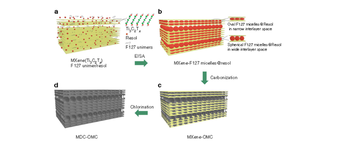 Wang[4]通过在二维纳米材料层间引入二维有序结构的介孔碳(OMC),合成了全碳逐层基序结构。选择MXenes作为二维宿主设计二维异质结构。从MXenes中去除金属元素,形成由MXene衍生碳(MDC)交替层组成的全碳2D-2D异质结构。插入到MDC层中的OMC层不仅可以防止重堆积,而且可以促进离子扩散和电子转移。得到的杂化碳在用作超级电容电极时展示了它们在未来电子设备中的潜力。该方法克服了二维纳米材料的重堆积问题,在二维宿主材料中构造离子可达的介孔碳。