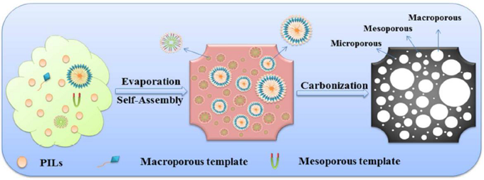 Sun[5]以双模板法,基于质子离子液体制备了氮硫共掺杂的多孔碳材料。以[Phne][HSO4]作为碳源和异质原子。首先将硫代二苯胺溶于丙酮和低浓度的硫酸中制备[Phne][HSO4]。然后将溶有F-127和OP-10的水溶液加入到[Phne][HSO4]中。得到的溶胶在氮气中煅烧得到氮硫共掺杂的多孔碳材料。