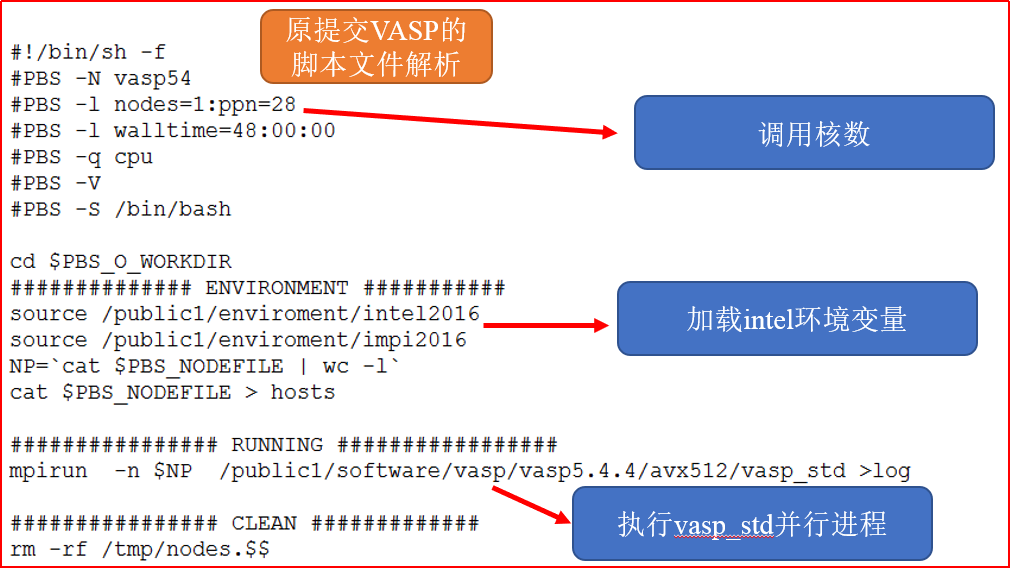 先找到提交VASP的脚本,例如vasp.pbs,内容解析如下(#PBS开头的是调用资源行):