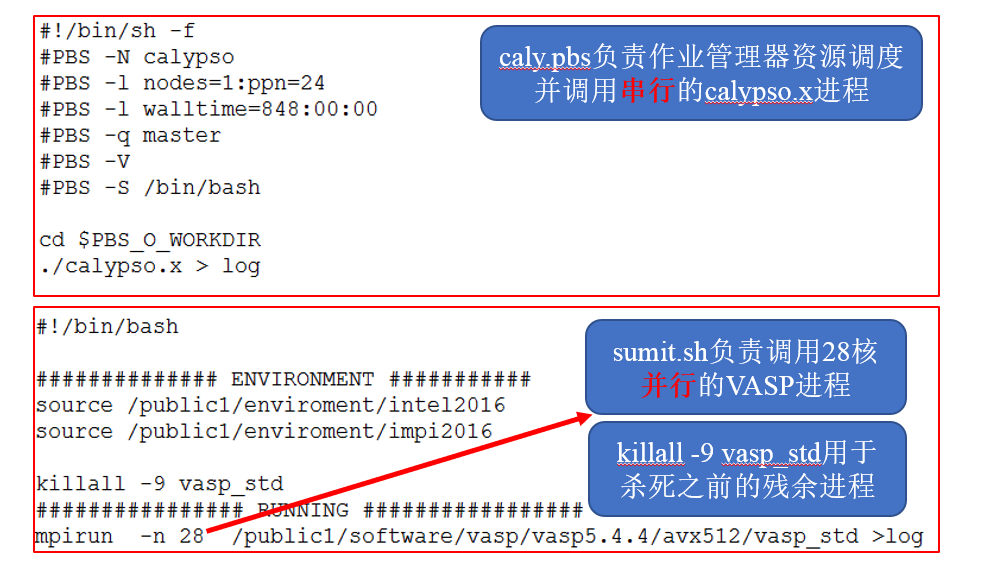 按照vasp.pbs的内容,改完后的caly.pbs和submit.sh如下,用qsub caly.pbs提交任务。对比一下就清楚了。(calypso.x是串行程序,不要用mpirun去执行;局域优化软件vasp需要用mpirun并行,主要加上killall -9 vasp_std)