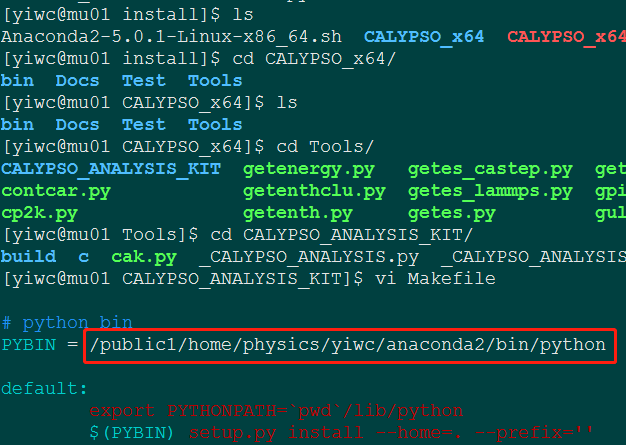 到相应的文件夹下去打开Makefile找到相应的这一行,修改为刚刚anaconda2文件夹下的python路劲,保存,退出,make